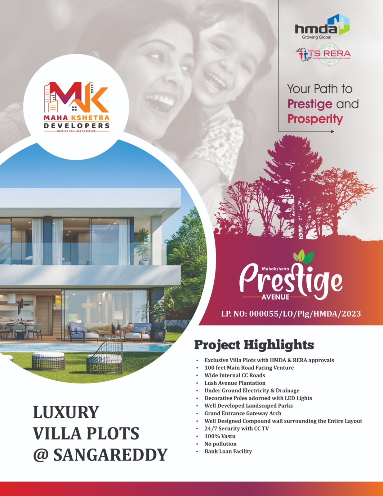 Mahakshetra Prestige Avenue,a prestigious venture by Maha Kshetra Developers that redefines the concept of luxury living. This project boasts a range of exceptional features and is adorned with HMDA and RERA approvals, ensuring peace of mind for discerning property enthusiasts.In "Mahakshetra Prestige Avenue," you'll discover a pathway to prestige and prosperity, where luxurious living meets unmatched convenience. Don't miss your chance to be a part of this exceptional development by Maha Kshetra Developers.